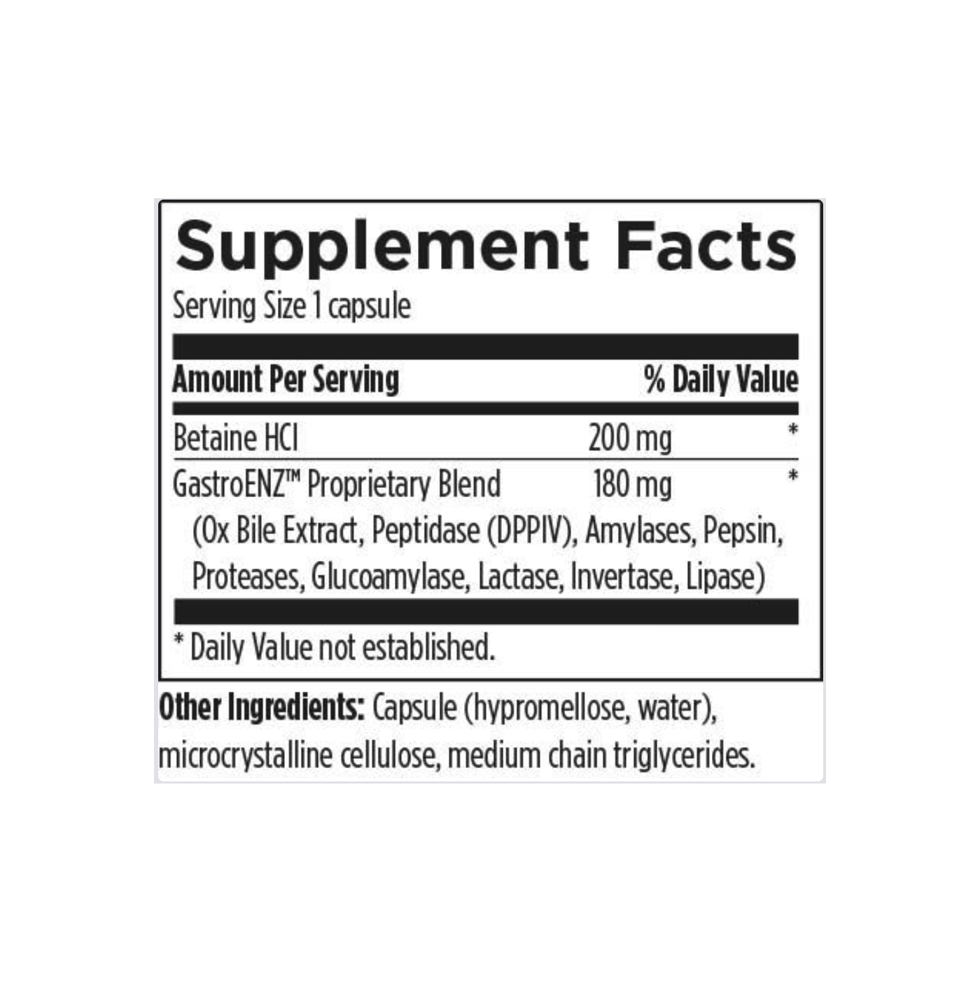 Digestzymes are engineered with betaine hydrochloride (HCl) which is an excellent source of hydrochloric acid (stomach acid). The enzymes include lipases, proteases, and amylases, which aid in the breakdown of fats, proteins, and starches, respectively. The ox bile extract provides bile acids, which are key to the digestion of fat and fat-soluble vitamins.