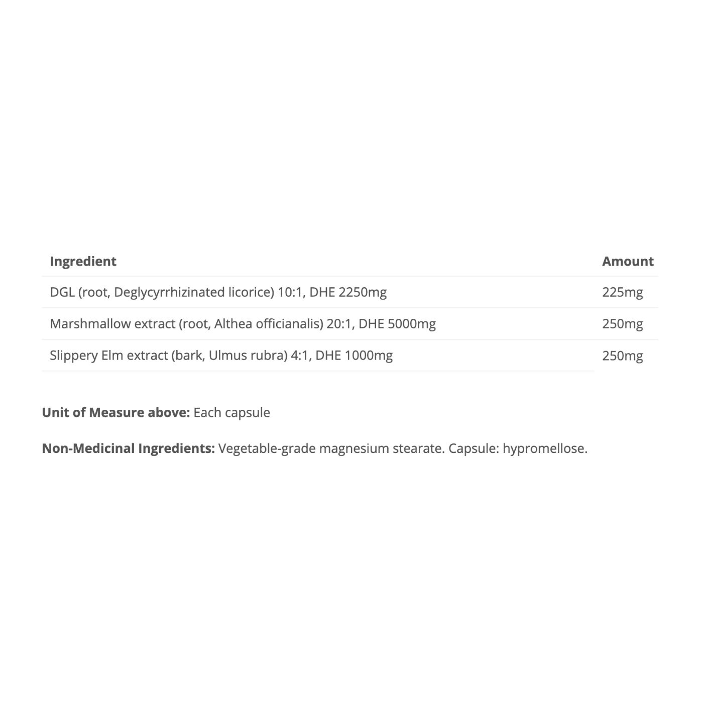 The demulcents, deglycyrrhizinated licorice (DGL), Althea officinalis (marshmallow root) and Ulmus rubra (slippery elm), in GI Soothe are some of the most well-established demulcents with clinical efficacy. GI Soothe is manufactured in state-of-the-art facilities following strict controls of purity, potency and consistency.